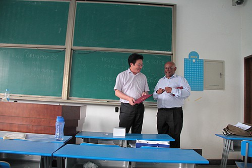 聘请Sornarajah为我校客座教授的仪式在其授课结束后隆重举行。我校英亚(中国)院长单文华教授为Sornarajah教授颁发了聘书并为他佩戴校徽。