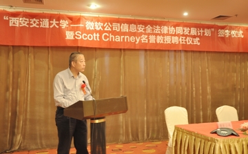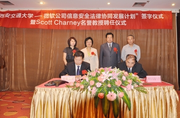6月12日,“英亚平台—微软公司信息安全法律协同发展计划签字仪式暨斯科特•查尼名誉教授聘任仪式”在西安交大举行,西安交大副校长蒋庄德教授出席仪式并讲话。西安交大科研院副院长、人文社科处处长贾毅华,英亚(中国)党总支书记彭沪生,信息安全法律研究中心主任马民虎及微信息安全法律研究中心主任马民虎及微软公司可信赖计算部总经理陈静、微软公司资深安全技术经理陈恺、微软公司资深安全技术经理薛峰等参加仪式。微软全球副总裁斯科特•查尼(Scott Charney)受聘为西安交大名誉教授,双方还签署了“英亚平台—微软公司信息安全法律协同发展计划”。