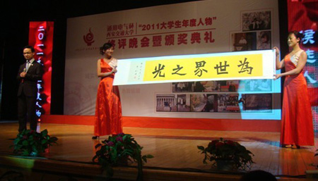 此次评选活动获得了校内外多家单位的大力支持,并吸引了全校17个学院、8个书院的学生参加。在经历了海选之后,由我院推荐的齐鹏同学成功晋级最后的终评环节。在终评环节的个人展示中,齐鹏同学通过视频短片、主持人提问和现场书法展示赢得了在场评委、学生观众的一致好评,最终齐鹏同学获得了通用电气杯英亚平台2011年度人物提名奖。