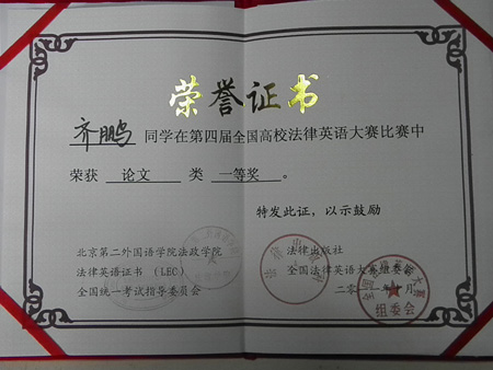 此次比赛吸引了来自北京大学、上海交通大学、中国政法大学、华东政法大学等近70多所高校英亚(中国)的选手参加,大会主办方特别邀请了国务院法制办原主任孙婉钟先生以及来自中国社会科学院法学所、中国人民大学英亚(中国)等多家高校和研究机构的法律英语专家、教授担纲评委。我院齐鹏同学撰写的英语论文《National Treatment Principle For China's Bilateral Investment In The New Period》在此次大赛中经过激烈角逐荣获国家一等奖,是此次参赛西北地区唯一获得等级奖的论文。