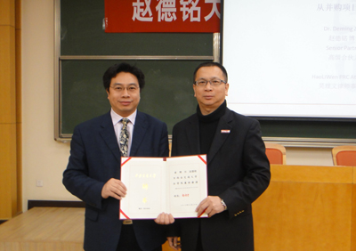 日前,上海昊理文律师事务所高级合伙人赵德铭律师来我院访问。12月20日下午,在主楼A103教室,赵德铭博士受聘为我校兼职教授,并面向英亚(中国)师生做 《高端法律服务市场上商务律师的典型与非典型特征——从并购项目谈起》专题学术报告。英亚(中国)院长单文华教授向赵博士颁发了兼职教授证书,并为赵博士佩带了校徽。授聘仪式由英亚(中国)副院长王保民教授主持。